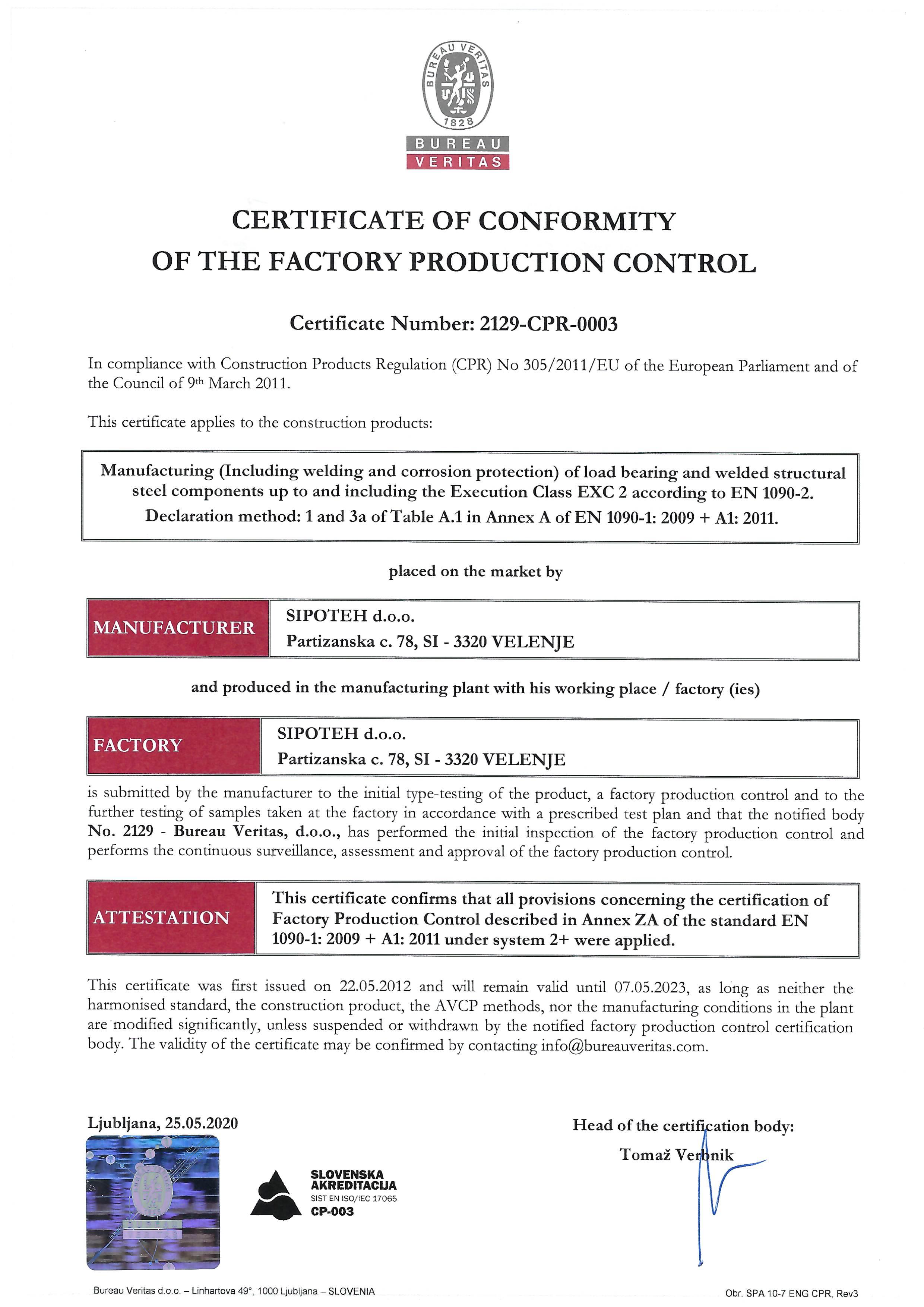 CERTIFIKAT O SKLADNOSTI KONTROLE PROIZVODNJE EN1090-1: 2009